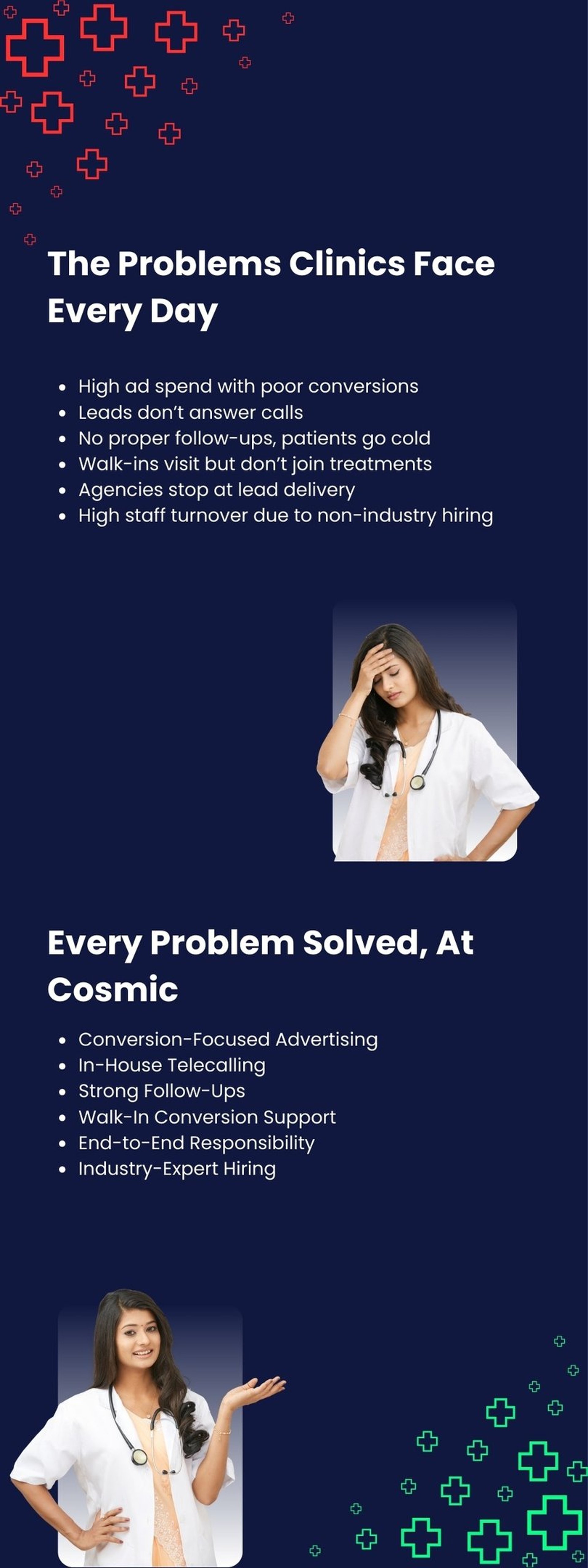 At Cosmic Connect Convert, we help clinics grow by directly delivering qualified walk-ins through a powerful mix of advertising, in-house tele marketing, follow-ups, and conversion strategies.